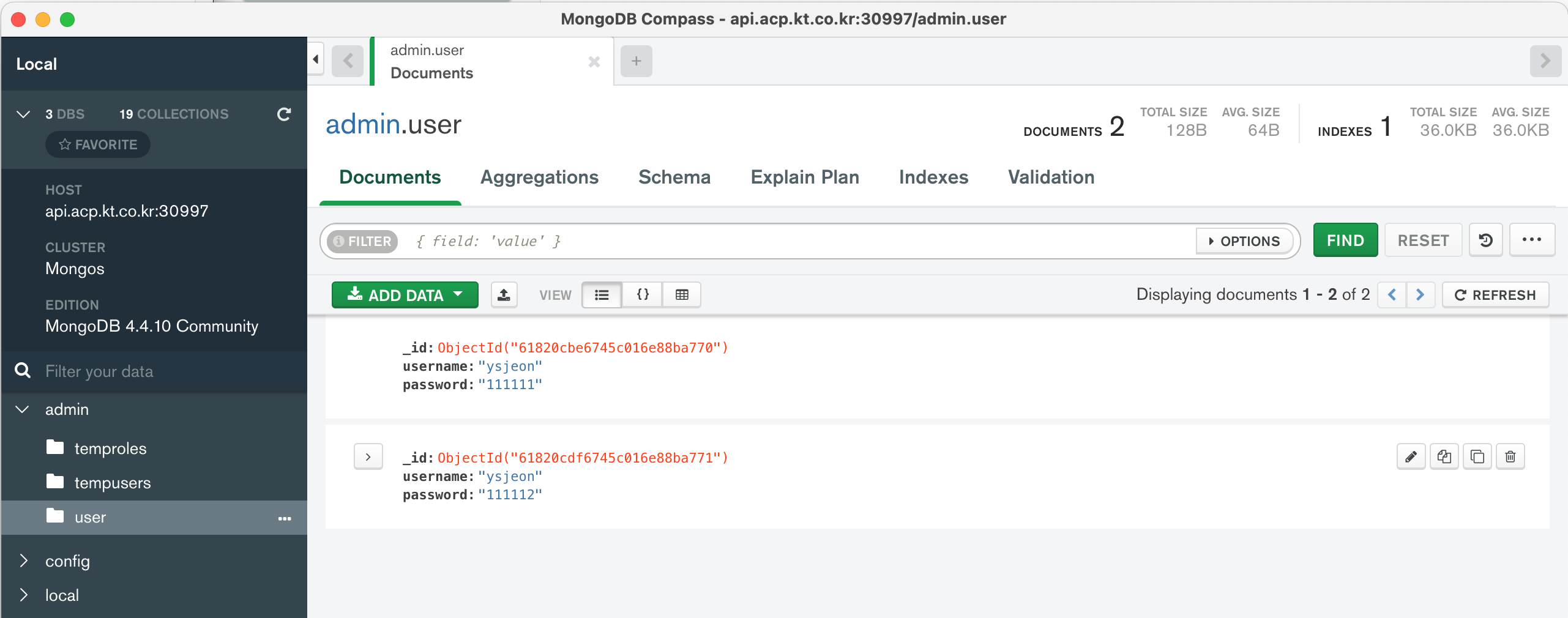 ✓ ysjeon MongoDB : mongodb://root:wLF4Ko6cvG@api.acp.kt.co.kr:30997/admin