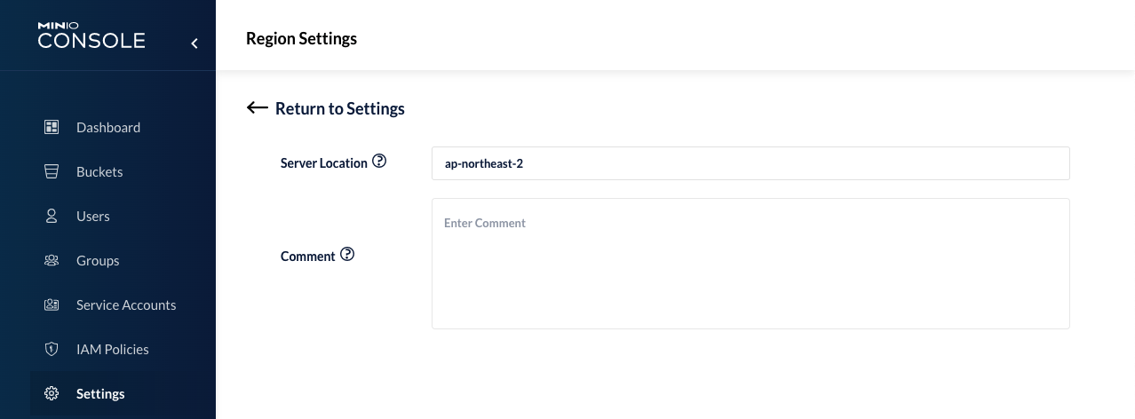 - Console 화면에서 Settings > Region을 선택 후 Server location 항목에 입력하고 저장 후에 MinIO를 재기동한다.