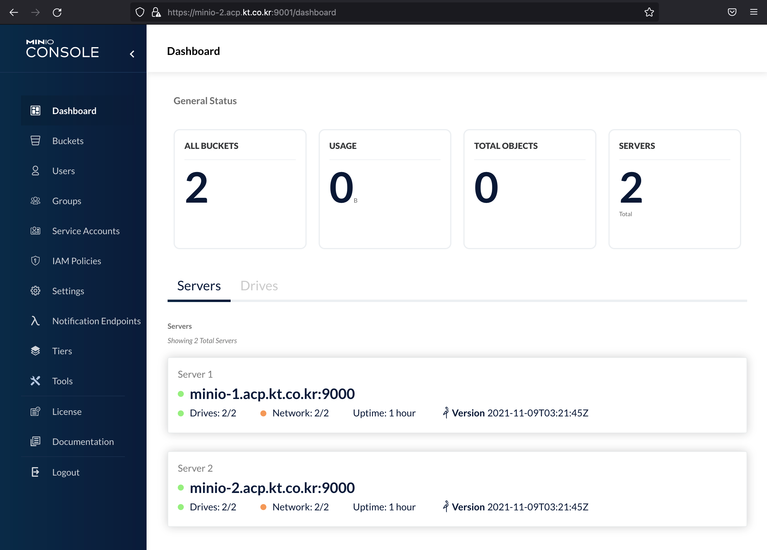 개별 서버 접근: https://minio-1.acp.kt.co.kr:9001, https://minio-2.acp.kt.co.kr:9001