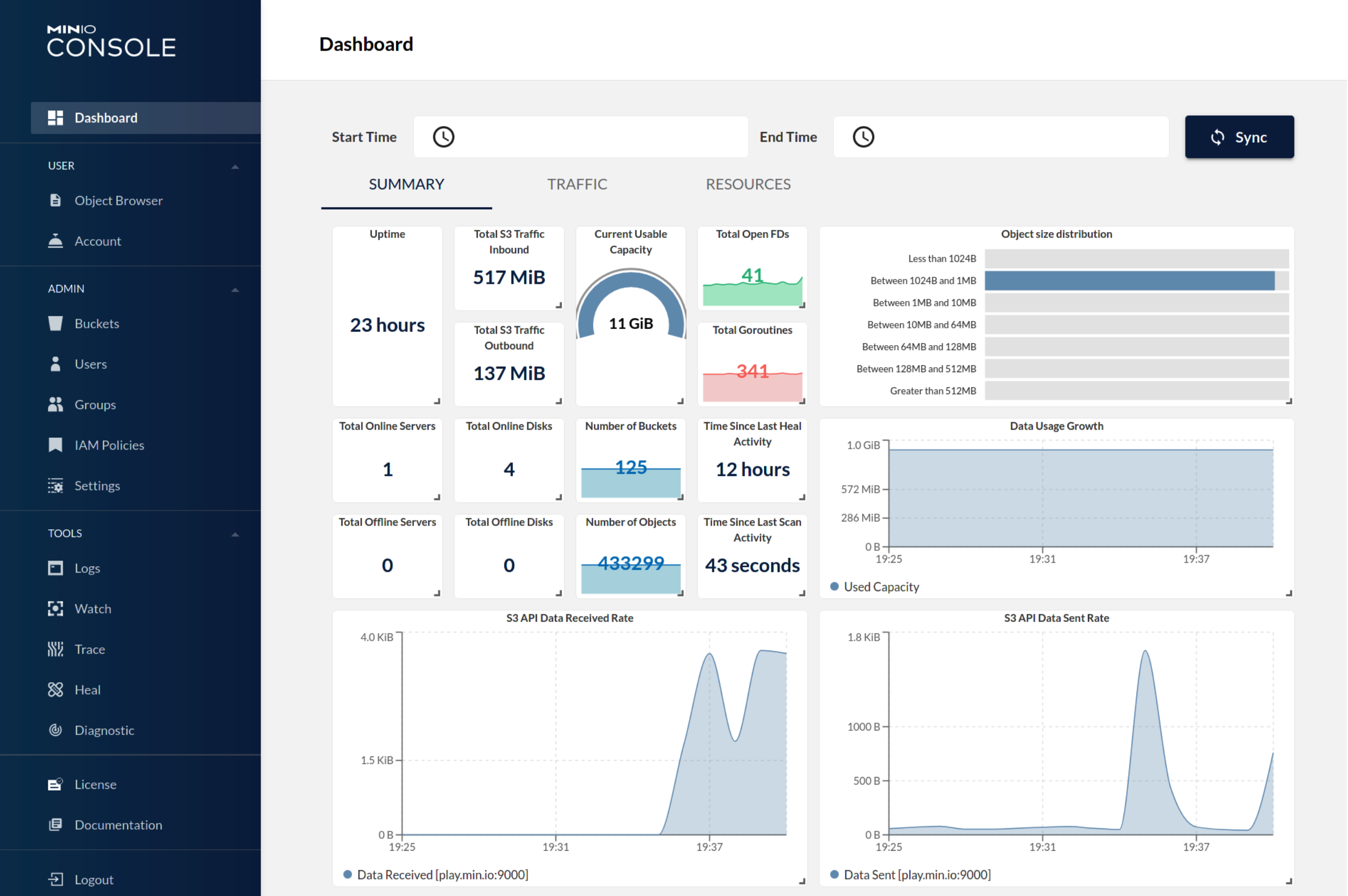 - Prometheus로 MinIO Metric 데이터를 수집 시 MinIO Console에서 아래와 같이 다양한 정보를 제공한다.