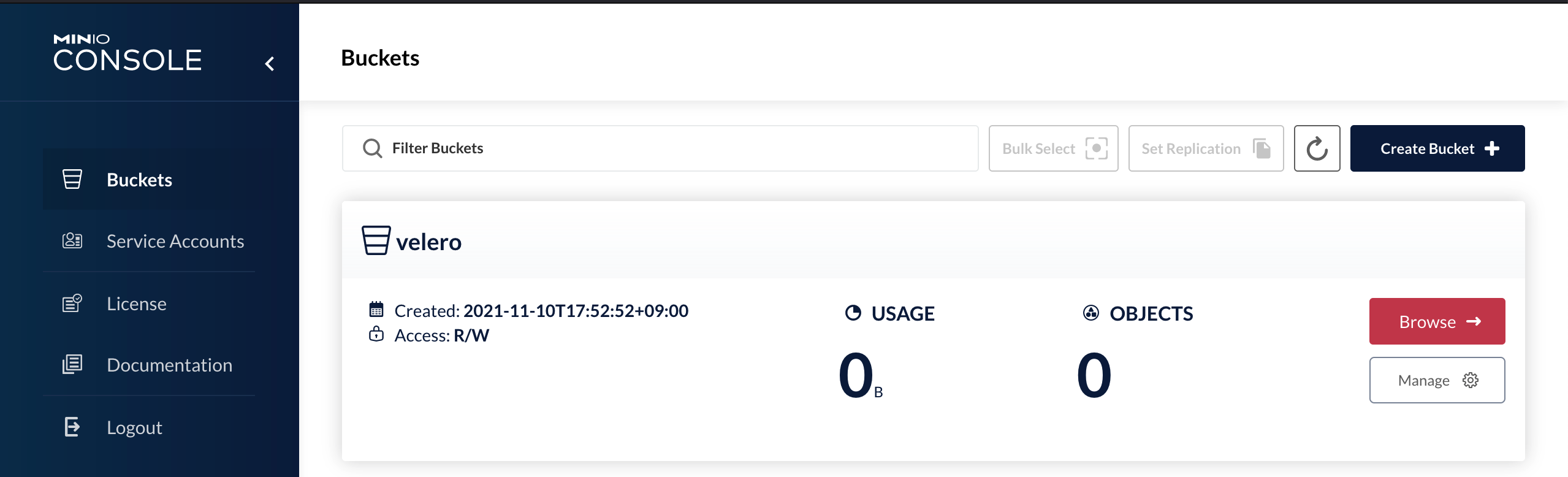 $ mc mb minio/velero --insecure