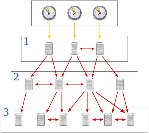NTP는 계층적인 구조를 가지며, 각각의 계층은 상위 계층으로부터 시간을 동기화한다.