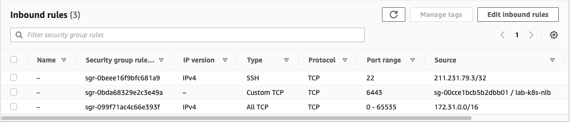 Kubernetes API Server를 위한 Amazon ELB(6443 포트)에서 접속할 수 있도록 ELB의 security group ID를 추가하였습니다.