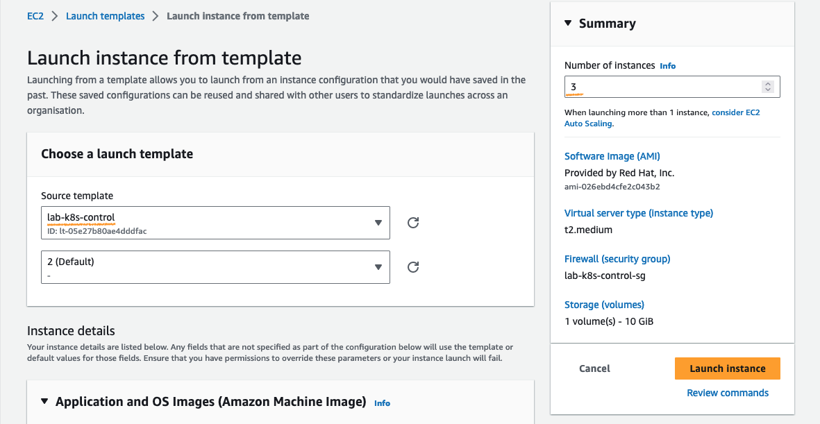 EC2 console > Instances > Instance Templates > {lab-k8s-control | lab-k8s-node} > Actions > Launch instance from template