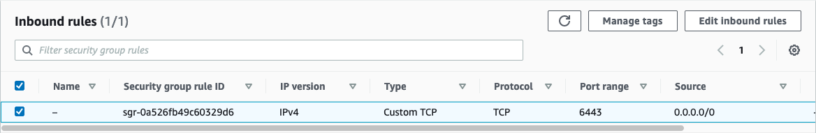 Amazon ELB에 적용할 security group입니다. 누구나 Kubernetes API Server에 접근할 수 있도록 Inbound 룰을 설정합니다.
