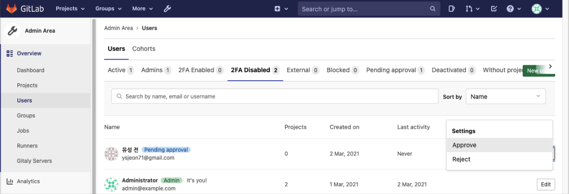 Admin Area > Overview > Users > 2FA Disabled > “승인할 Name” 선택 > Approve