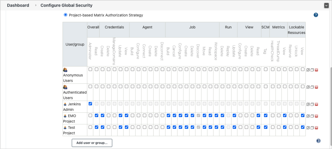 Jenkins 관리 > Security > Configure Global Security > Authorization > Project-based Matrix Authorization Strategy