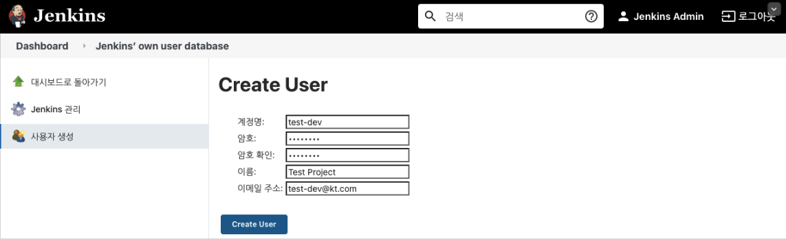 Jenkins 관리 > Security > Manage Users > 사용자 생성