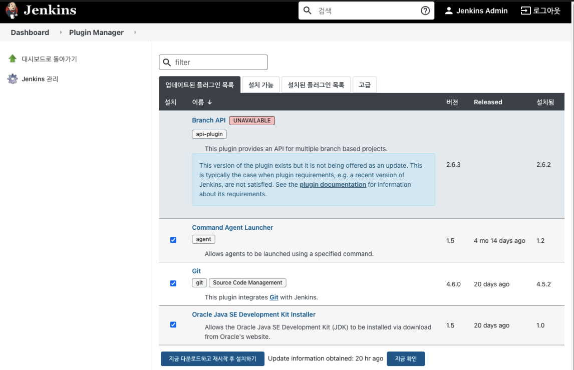 Jenkins 관리 > System Configuration > 플러그인 관리 > 업데이트된 플러그 인 목록