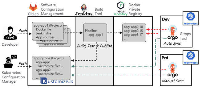 ✓ 설정 파일은 Kustomize 기반으로 구성하고 시스템별 특성을 고려해서 운영 (ex. 개발/운영을 분리)
