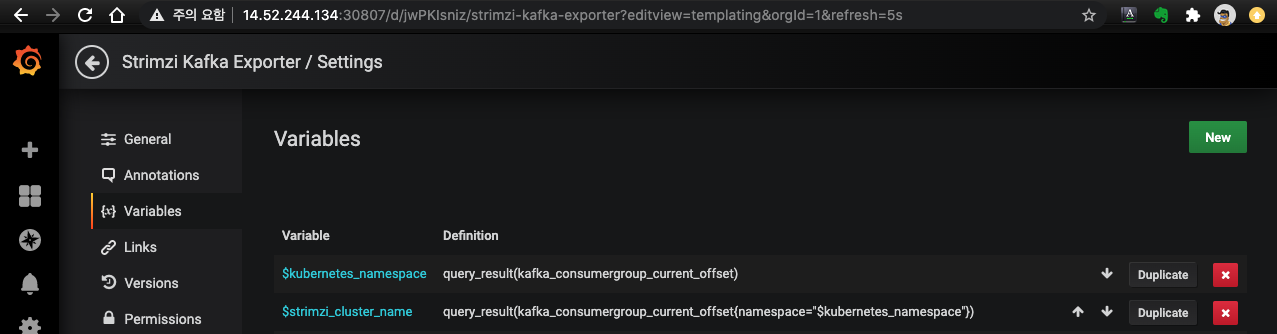 - 메뉴: Strimzi Kafka Exporter > Dashboard settings > Variables