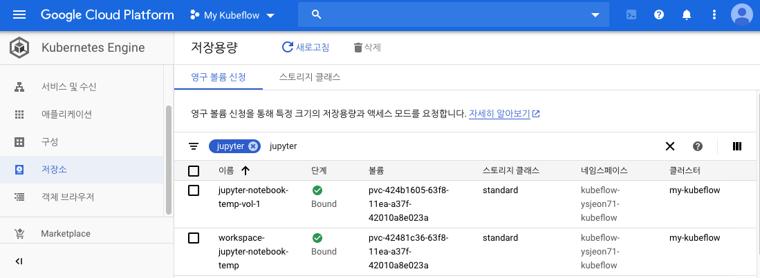 PVC 확인하기 (GCP > kubernetes Engine > 저장소