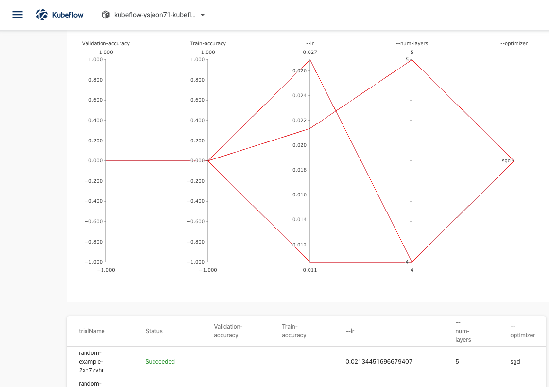$ POD_NAME=$(kubectl get pods -n kubeflow --selector=experiment=random-example --template '{{range .items}}{{.metadata.name}}{{"\n"}}{{end}}')