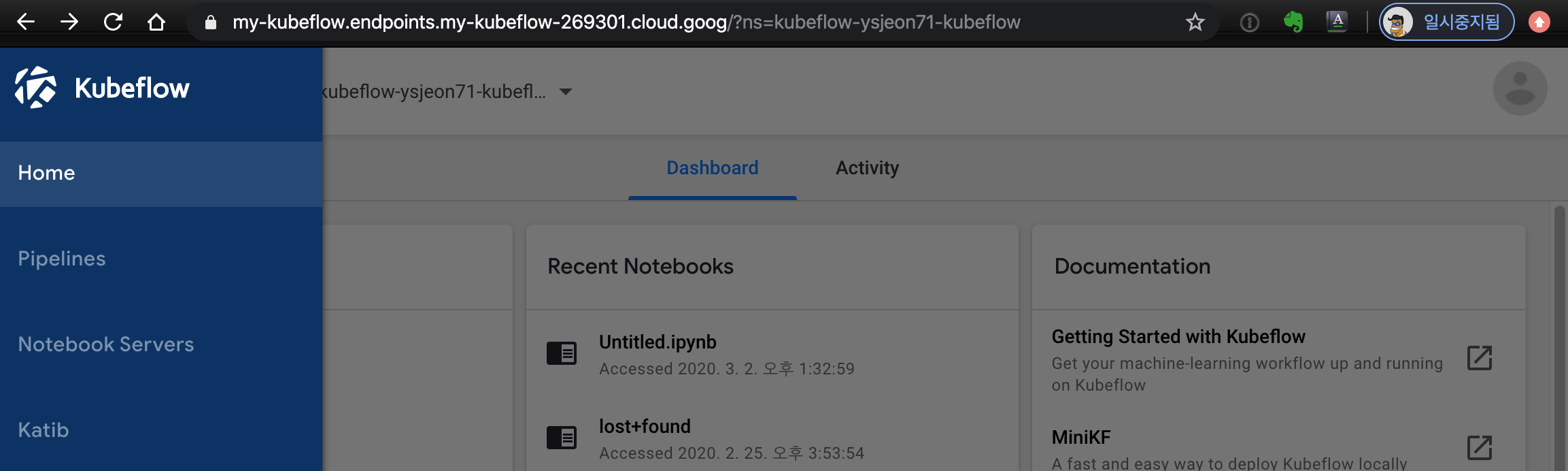 - Kubeflow 접속: https://my-kubeflow.endpoints.my-kubeflow-269301.cloud.goog