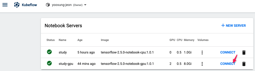 Menu (좌측 상단 ) > Notebook Servers > ‘New Server’