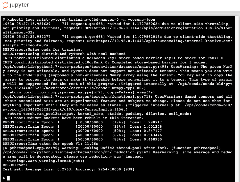 $ cp -r data `k get pvc -n yoosung-jeon | grep -w mnist-pytorch-pvc | awk '{printf("/nfs_01/yoosung-jeon-%s-%s", $1, $3)}'`