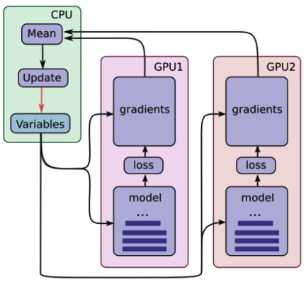 각각의 GPU 장치마다 복제본 만듬, 변수를 미러링하지 않고 CPU에서 관리